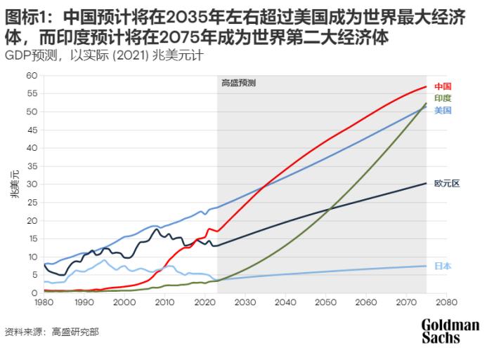 通过采用新数据和新方法,高盛经济学家的研究标的覆盖104个经济体,2035年中国将超越美国成世界最大经济体,2075年印度再次超越美国跃升为世界第二。