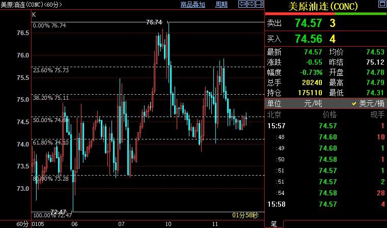 北京时间15:58,NYMEX原油期货下跌0.79%至74.53美元/桶;ICE布伦特原油期货下跌0.55%至79.66美元/桶。