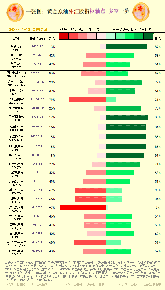 嘉盛集团APP讯——一张图:黄金原油外汇股指"枢纽点+多空占比"一览。今日(2023/01/12周四)最新出炉的数据显示,截止上个交易日结束时,头寸达到80%及以上的品种有:★
