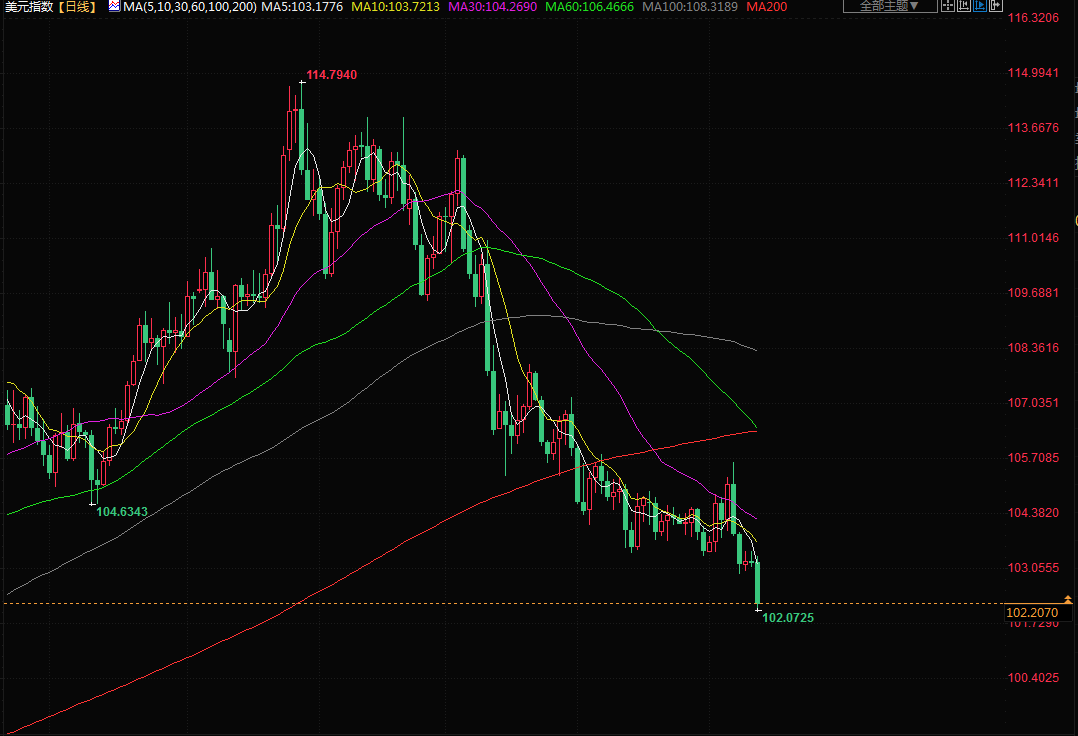 美元周四下跌,触及近半年新低至102.07,美国劳工部发布12月CPI数据,整体与核心通胀均如期走低;美联储布拉德称,美联储需要避免20世纪70年代事件的重演,必须将利率维持在足够高的水平,以确保通胀下降,美联储12月点阵图显示,2023年利率将超过5%,倾向于尽快将利率提高到5%以上。