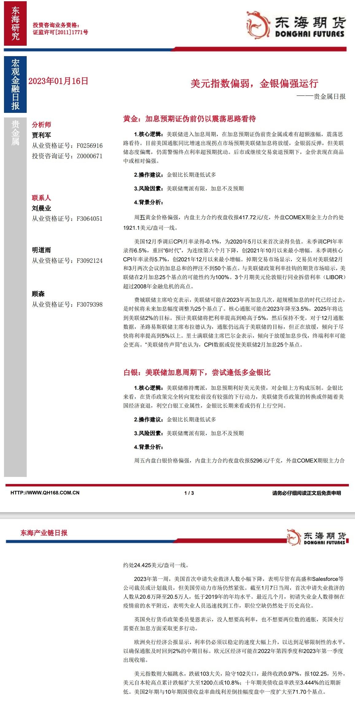 更新: 16 01月 嘉盛集团APP讯——黄金:加息预期证伪前仍以震荡思路看待。白银:美联储加息周期下,尝试逢低多金银比。东海期货公司授权文本由“专注期货开户交易及专业行情分析资讯网站”:【一期货 www.1qh.cn】转发 标题:【东海期货1月16日产业链日报】贵金属篇:美元指数偏弱,金银偏强运行 地址:https://www.jiasmai.com/article/1622.html ← 【东海期货1月16日宏观金融日报】:人民币持续走强,国内风险偏好持续升温 → 【东海期货1月16日产业链日报】能化篇:中国需求预期乐观,市场继续回暖