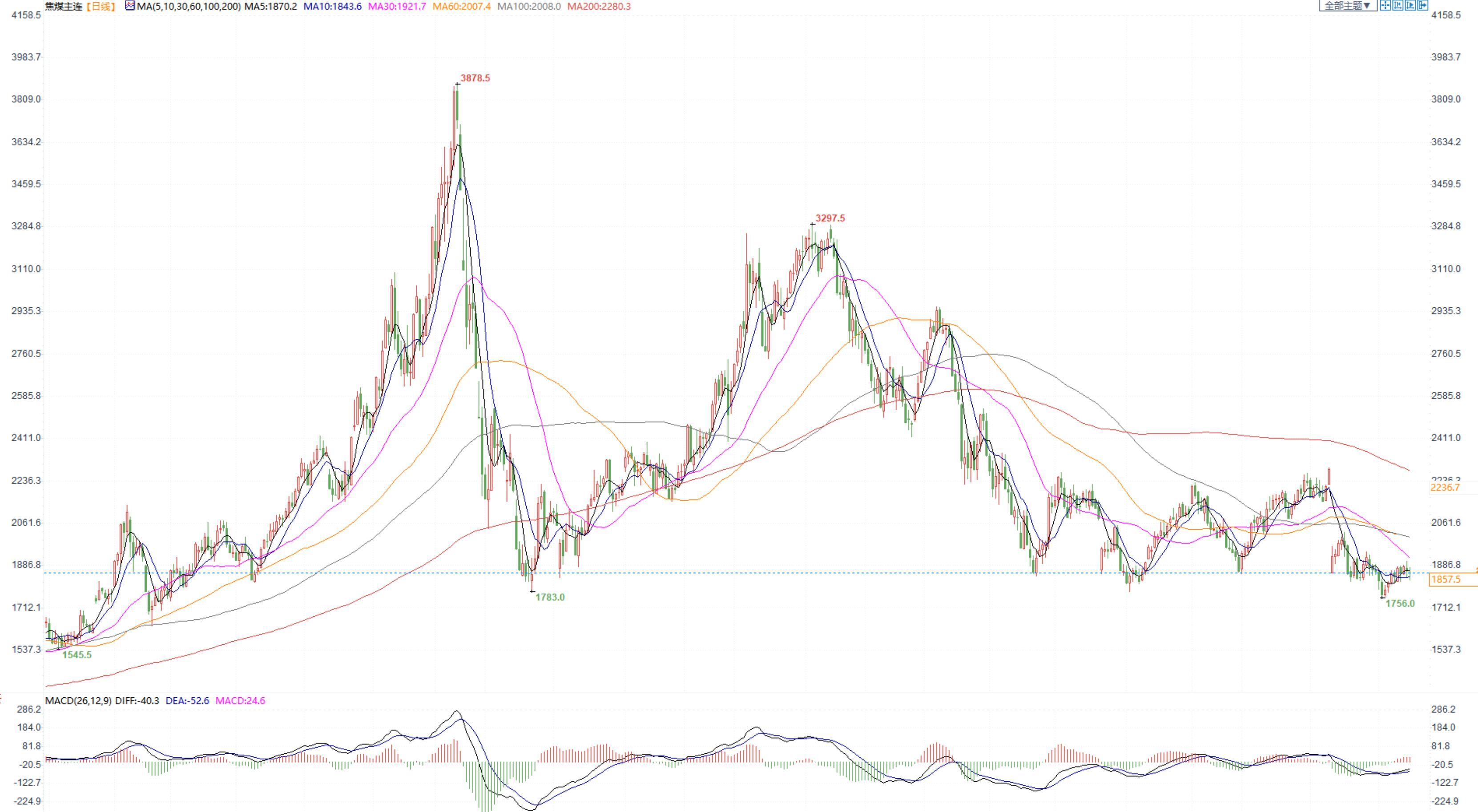 价格:今日05合约收于1857.5,日线级别震荡运行,山西中硫主焦仓单成成本2100元/吨。