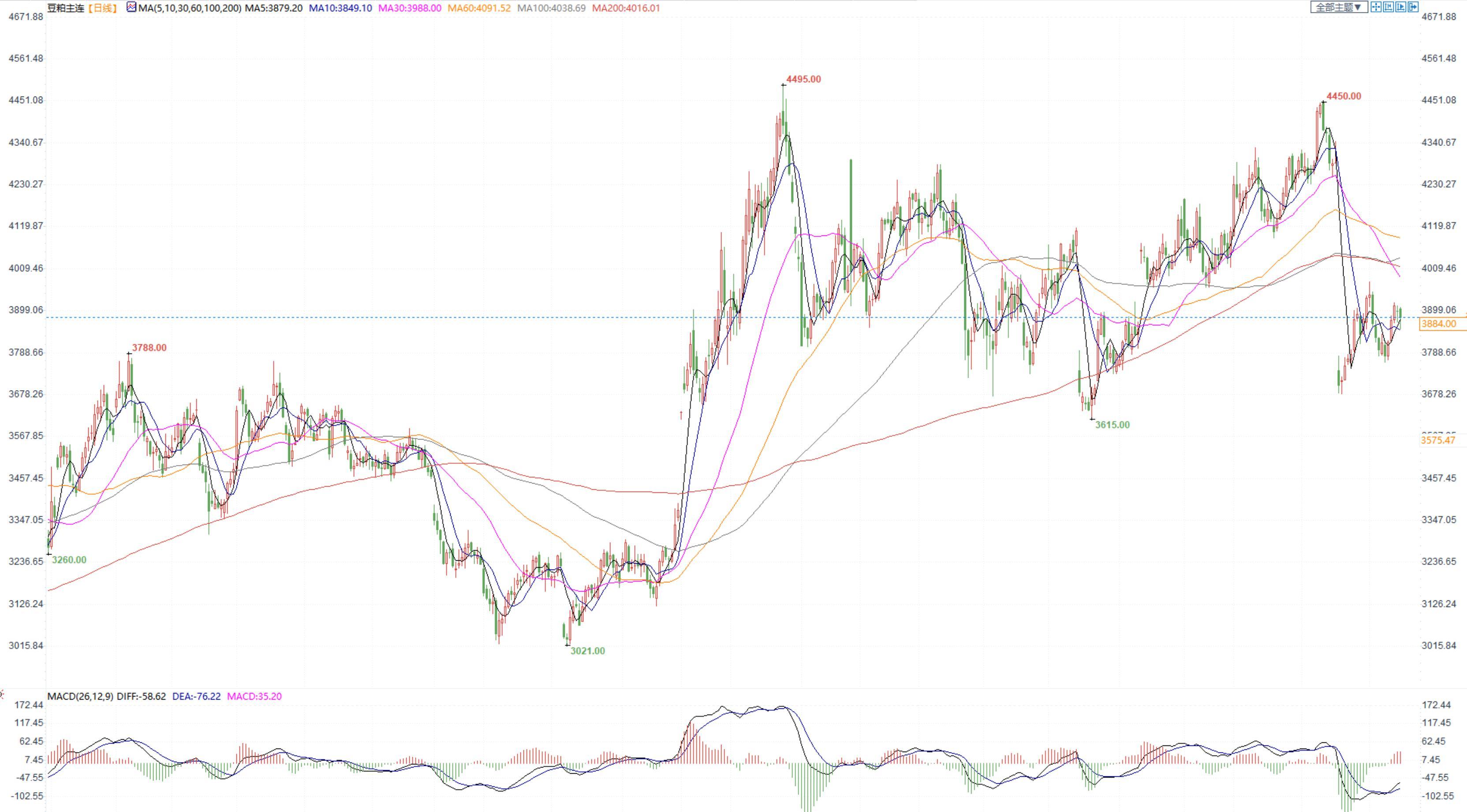 豆粕2305合约日内跌0.28%,收盘价3884元/吨,现货张家港43%蛋白豆粕4575元/吨