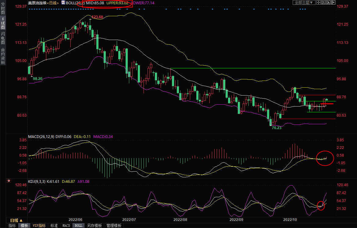 日线级别:震荡;MACD初步金叉,KDJ初步金叉,油价初步顶破了10月17日以来的震荡区间82.06-87.12区域,在跌破87.12前,短线偏向多头,初步阻力在日内高点88.46附近,10月12日高点阻力在90.05附近,布林线上轨阻力目前在93.03附近,未来几个交易日油价有望涨向该位置附近。强阻力在100日均线93.71附近,10月10日高点阻力也在该位置附近。