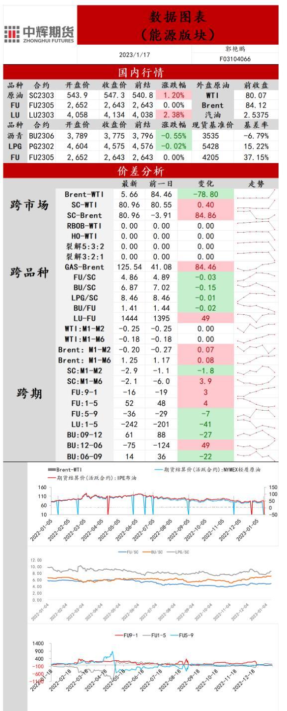 消息面:供需:中印从俄罗斯进口原油数量增加,2021年俄罗斯原油占印度进口比例约2.2%,目前已成印度最大来源国,每天进口数量约100万桶,中国1-11月从俄罗斯进口原油同比增长10.2%至7978万吨;俄罗斯2022年原油产量约5.35亿吨,同比增长2%,约1070万桶/日;据国家统计局数据显示12月中国原油加工量为5988万吨,同比增长2.5%。宏观经济:1月17日国家统计局公布2022年中国GDP为1210207亿元,按不变价格计算,比上年增长3.0%。