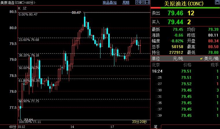 北京时间16:25,NYMEX原油期货下跌0.78%至79.25美元/桶;ICE布伦特原油期货上涨0.18%至84.81美元/桶。(注:隔夜恰逢美国休市,NYMEX原油无结算价)
