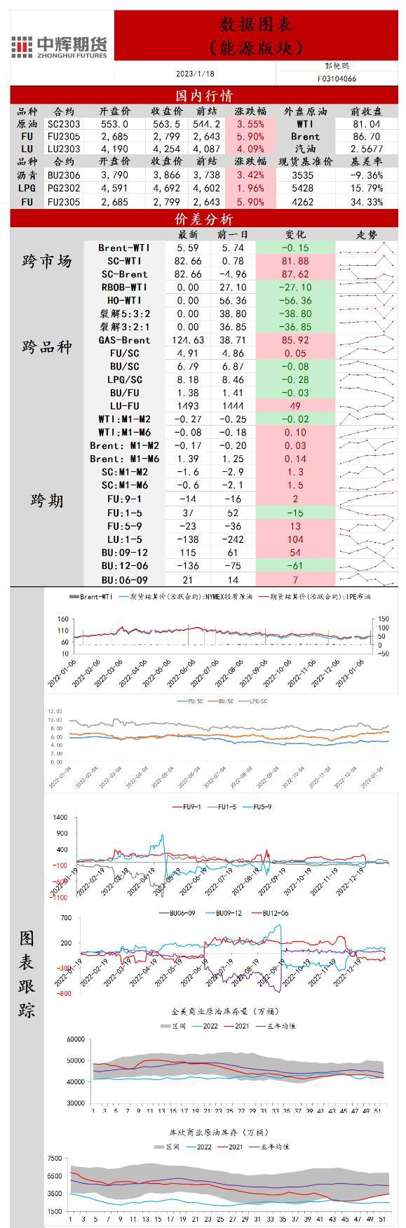 2、OPEC1月份月报预计2022年全球原油需求为9955万桶/日,2023年全球石油需求将增加222万桶/日,与上月报告持平,预计中国石油需求将增加51万桶/日。