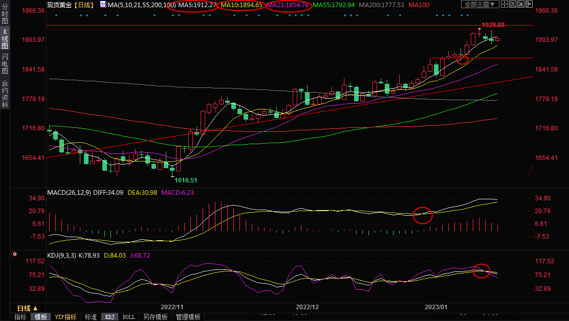 由于MACD金叉信号仍在,而且高位十字星后金价回调力度较小,金价还受到1900整数关口的支撑,金价后市仍留有震荡冲高的机会,初步阻力在5日均线1912.29附近,然后是1920整数关口,近期高点阻力在1928.88附近,4月21日低点阻力在1936.60附近。