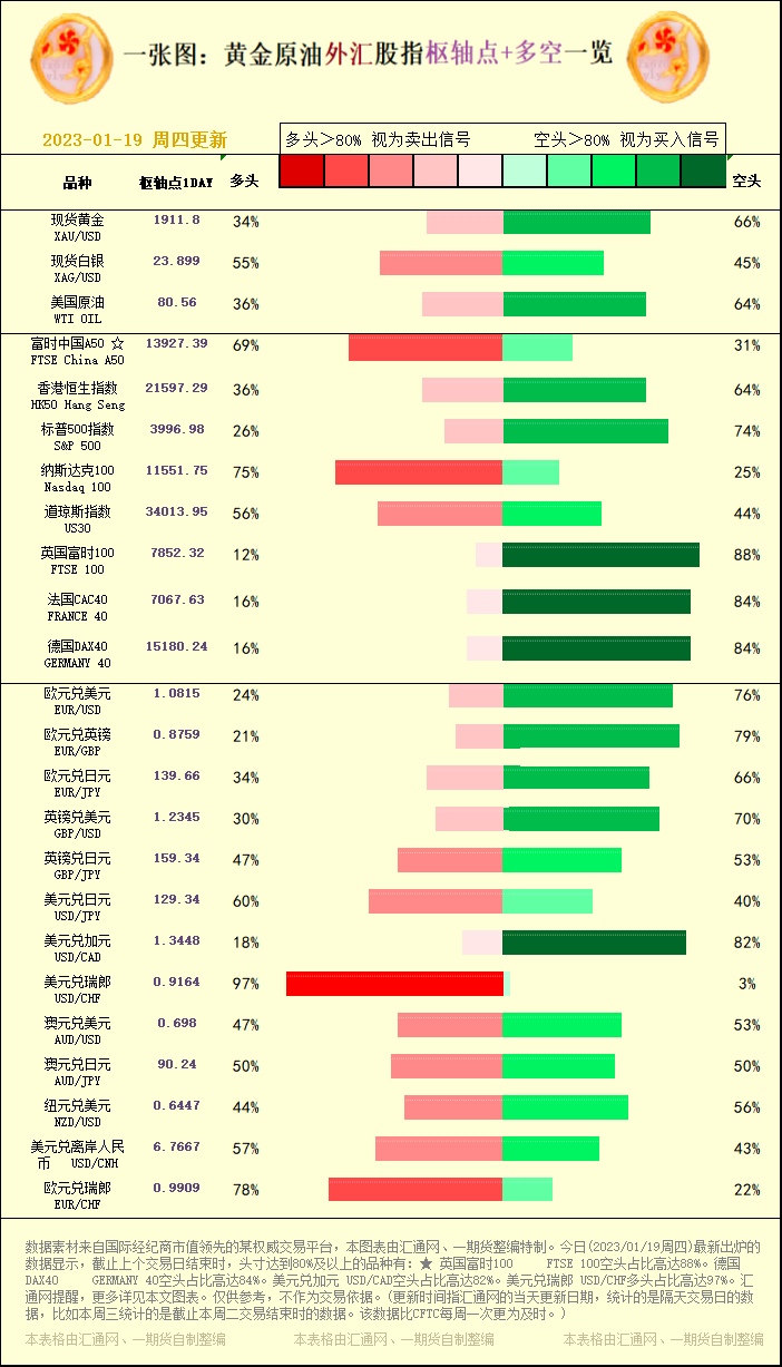 更新: 19 01月 嘉盛集团APP讯——一张图:黄金原油外汇股指"枢纽点+多空占比"一览。今日(2023/01/19周四)最新出炉的数据显示,截止上个交易日结束时,头寸达到80%及以上的品种有:★ 英国富时100 FTSE 100空头占比高达88%。德国DAX40 GERMANY 40空头占比高达84%。美元兑加元 USD/CAD空头占比高达82%。美元兑瑞郎 USD/CHF多头占比高达97%。汇通网提醒,更多详见本文图表。仅供参考,不作为交易依据。【本图表涉及到的交易品种有:现货黄金、现货白银、美国原油、富时中国A50、香港恒生指数、标普500指数、纳斯达克指数、道琼斯指数、英国富时100、法国CAC40、德国DAX40、欧元兑美元、欧元兑英镑、欧元兑日元、英镑兑美元、英镑兑日元、美元兑日元、美元兑加元、美元兑瑞郎、澳元兑美元、澳元兑日元、纽元兑美元、美元兑离岸人民币、欧元兑瑞郎。】(更新时间指汇通网的当天更新日期,统计的是隔天交易日的数据,比如本周三统计的是截止本周二交易结束时的数据。该数据比CFTC每周一次更为及时。) 标题:一张图:黄金原油外汇股指"枢纽点+多空占比"一览(2023/01/19周四) 地址:https://www.jiasmai.com/article/1691.html ← 油价挑战100日均线失败,未来仍有上行潜力!主要经济有望避免衰退,助力市场信心升温 → 美联储褐皮书:通胀压力有所缓解 经济活动不温不火