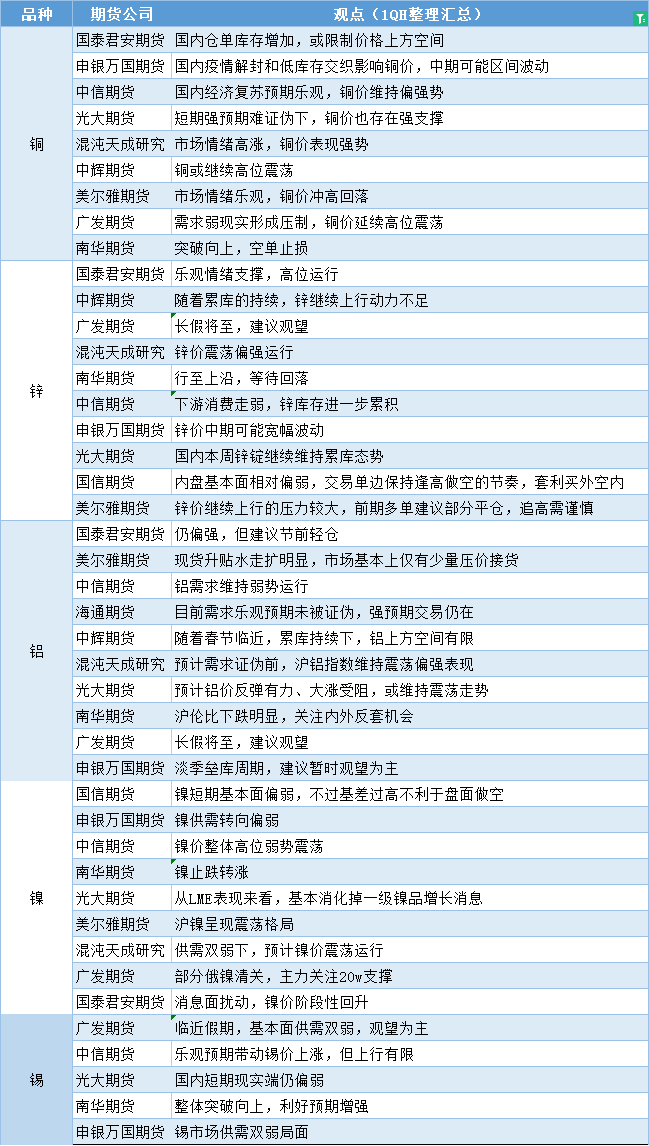更新: 19 01月 嘉盛集团APP讯——期货公司观点汇总一张图:1月19日有色系(铜、锌、铝、镍、锡等) 标题:期货公司观点汇总一张图:1月19日有色系(铜、锌、铝、镍、锡等) 地址:https://www.jiasmai.com/article/1697.html ← 期货公司观点汇总一张图:1月19日农产品(棉花、豆粕、白糖、玉米、鸡蛋、生猪等) → 期货公司观点汇总一张图:1月19日黑色系(螺纹钢、焦煤、焦炭、铁矿石、动力煤等)
