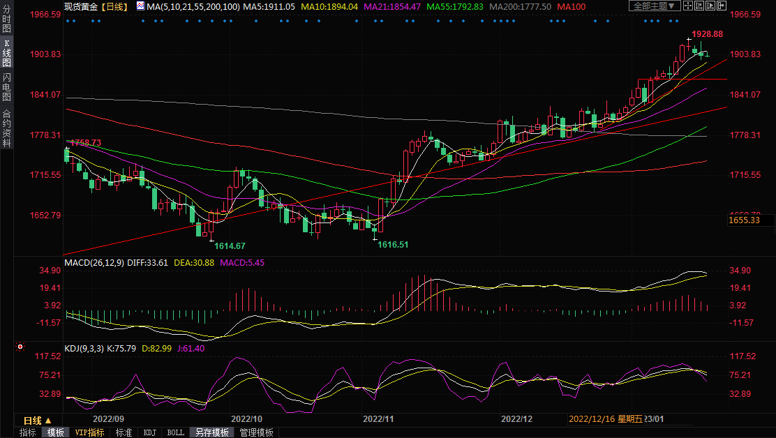 整体来看,虽然近期美国数据反映了美国通胀增速放缓,市场对美联储放缓加息步伐的预期进一步升温,但美国整体通胀水平依然较高,劳动力市场依然强劲,美联储关键决策者表明他们打算继续提高利率以抗击通胀,市场对全球经济衰退的担忧情绪小幅回落,这将令上涨动能减弱的金价短线面临进一步震荡调整甚至是回调风险,下方关注10日均线1893.86和6月13日高点1878.65(短线上涨趋势线支撑也在该位置附近)附近支撑。上方留意5日均线1910.71附近阻力。