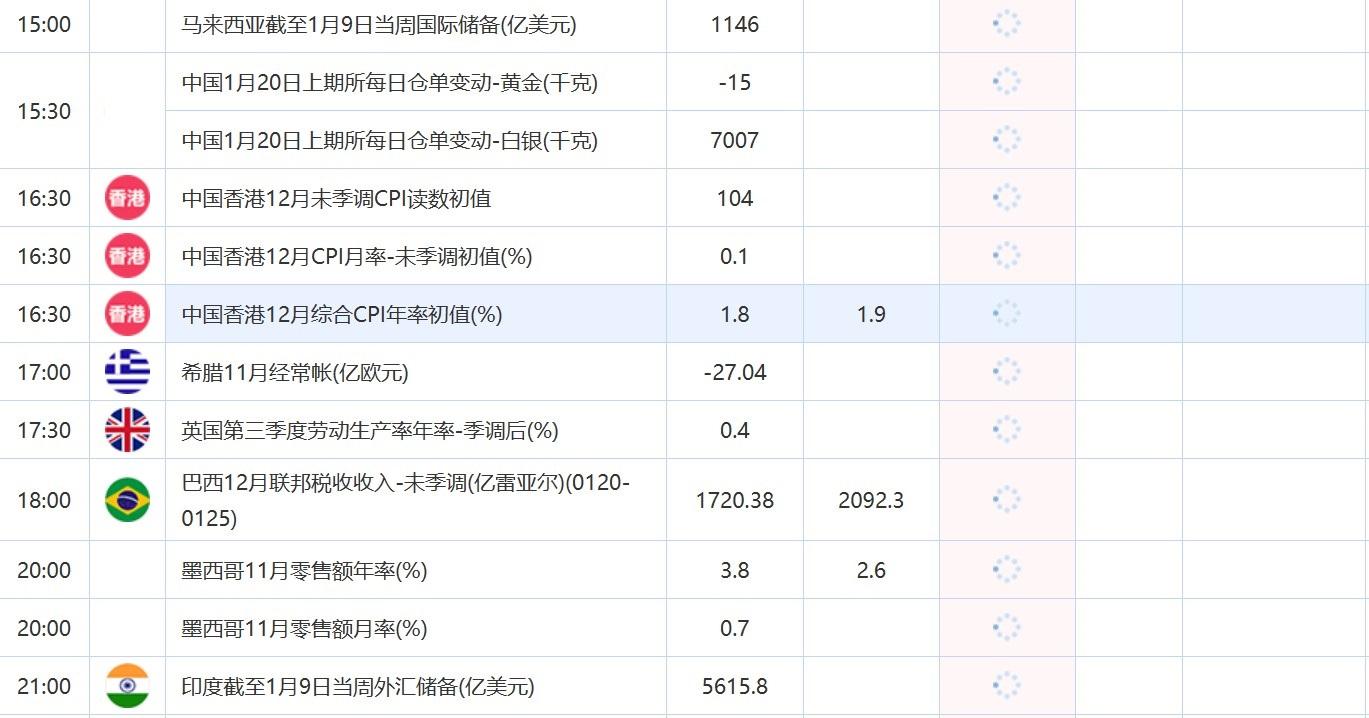 16:30 中国香港12月综合CPI年率初值(%) , 前值 1.8 , 预期值 1.9 , 公布值:待发布