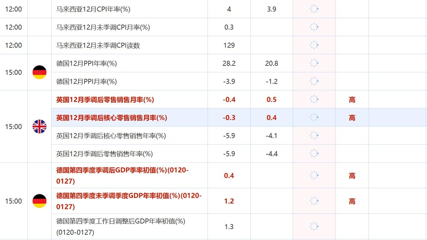 15:00 英国12月季调后核心零售销售月率(%) , 前值 -0.3 , 预期值 0.4 , 公布值:待发布