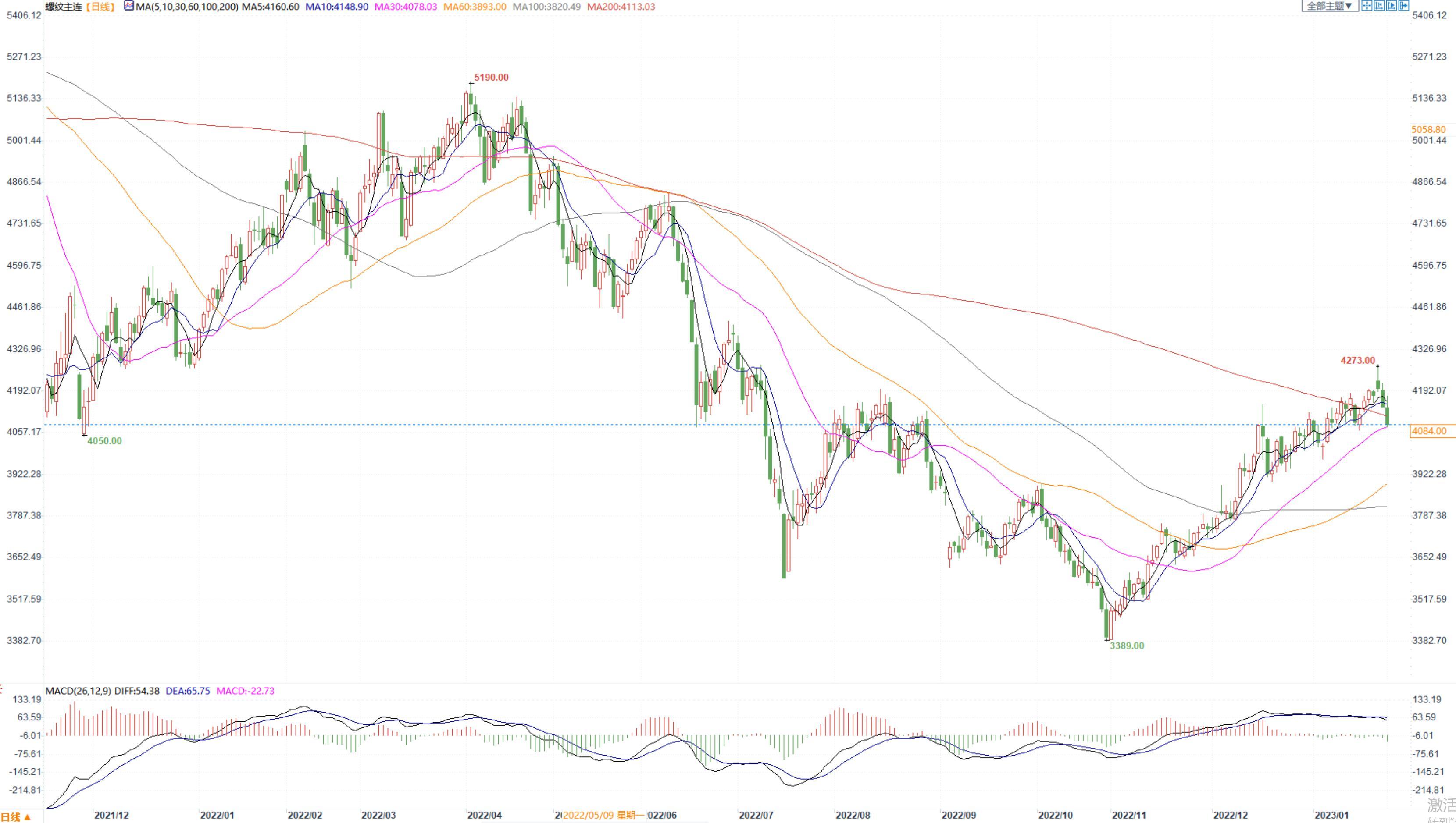 价格:今日黑色系继续延续弱势,各品种继续下行。螺纹钢2305合约夜盘小幅回升后白天继续下挫,收盘价4084元/吨,较昨日结算价下跌97点,收跌2.32%。今日现货价也跟随期货有所走弱,上海中天现货价4190元/吨,较昨日下跌40元/吨。