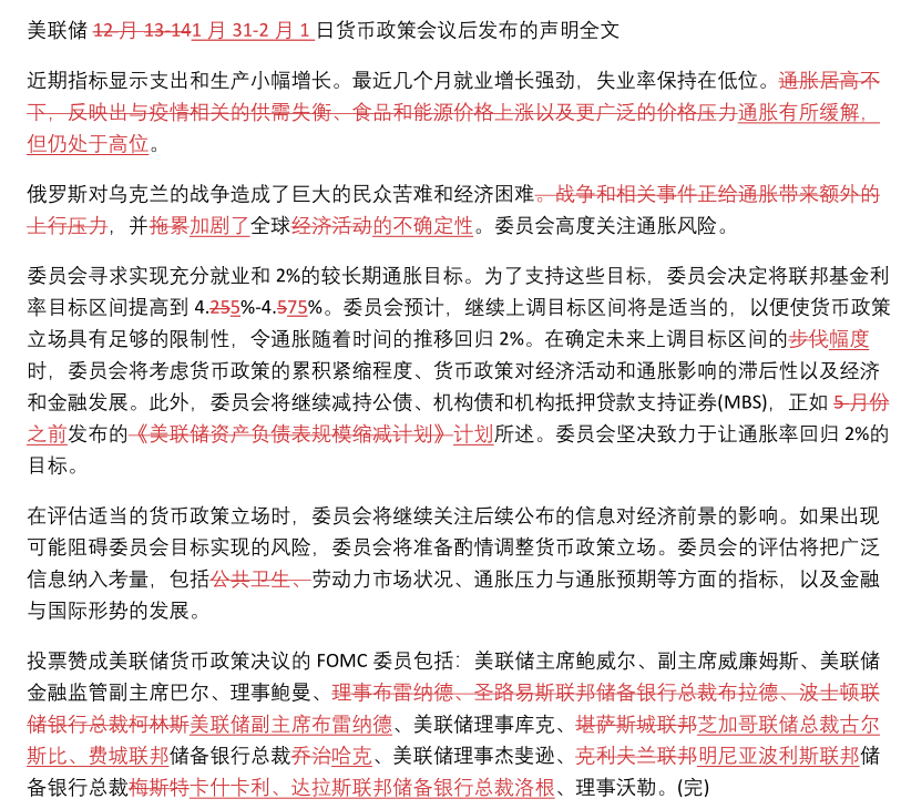 与上次利率决议相比,本次美联储声明主要删除了通胀居高不下的描述,以下为近两次声明对比详情: