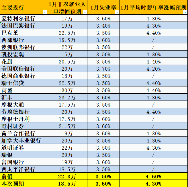 更新: 02 02月 嘉盛集团APP讯——北京时间周五(2月3日)21:30,美国将公布1月季调后非农就业人口变动和失业率。周四(2月2日),包括摩根士丹利在内的22家大型投行发表了对此次数据的前瞻,具体如下。22家大型投行预测显示,多数投行认为1月非农增速进一步下滑,但投行之间的增幅预期差距较大。具体而言,美国1月季调后非农就业人口增幅料介于15万-30.5万(前值22.3万),失业率料介于3.4%-3.7%(前值3.5%),平均时薪年率增幅料介于4.3%-4.4%(前值4.6%)。若数据显示1月非农增幅真如投行预测那样下滑,黄金有望获得支撑。 标题:22家投行预测1月非农:增幅料进一步缩小,黄金有望获得支撑 地址:https://www.jiasmai.com/article/1904.html ← 国际金价后市上看1969美元,FED鹰派终究再任性了 → 美原油交易策略:美元走弱支撑油价,但库存担忧挥之不去