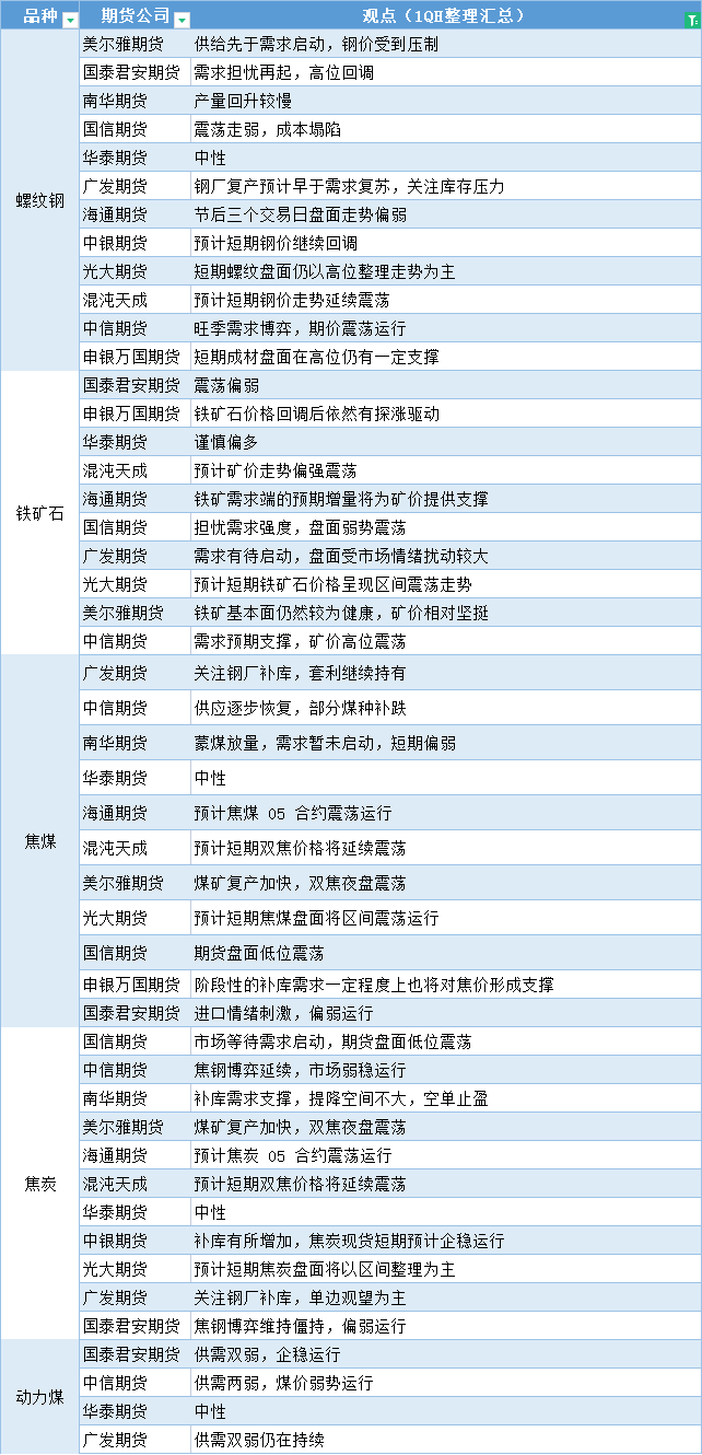 更新: 02 02月 嘉盛集团APP讯——期货公司观点汇总一张图:2月2日黑色系(螺纹钢、焦煤、焦炭、铁矿石、动力煤等) 标题:期货公司观点汇总一张图:2月2日黑色系(螺纹钢、焦煤、焦炭、铁矿石、动力煤等) 地址:https://www.jiasmai.com/article/1915.html ← 期货公司观点汇总一张图:2月2日有色系(铜、锌、铝、镍、锡等) → 国信期货早评:原油下挫,燃料油走弱,PTA随油价下跌