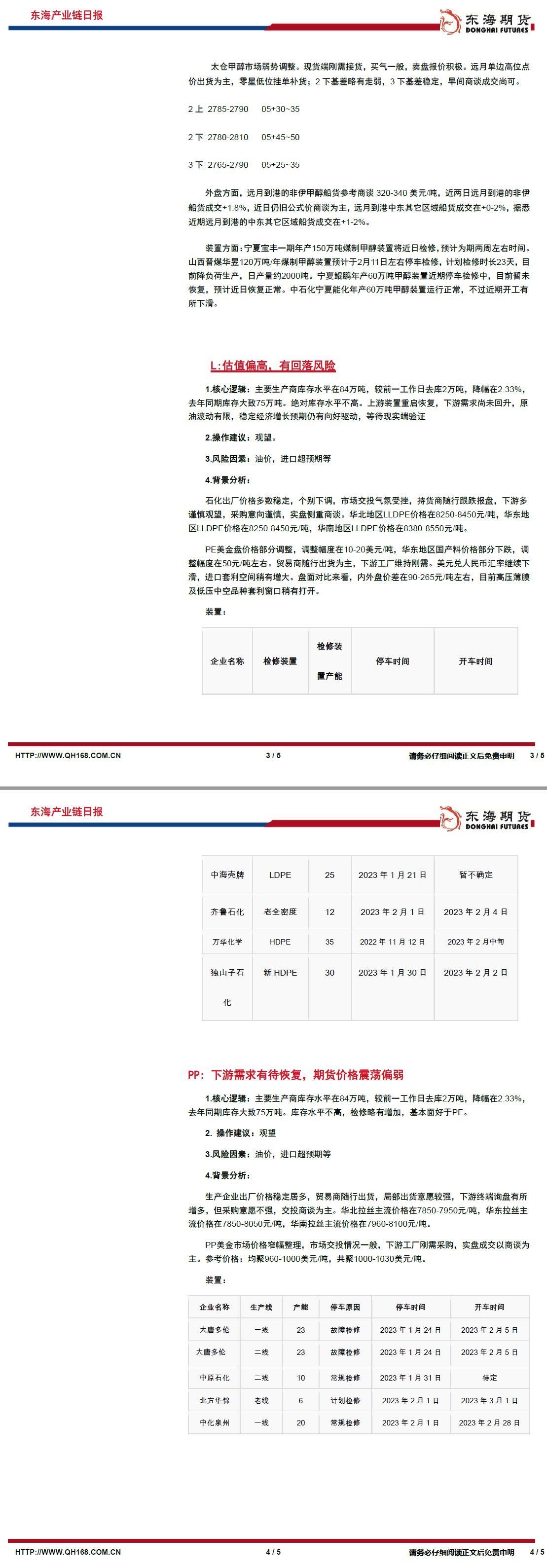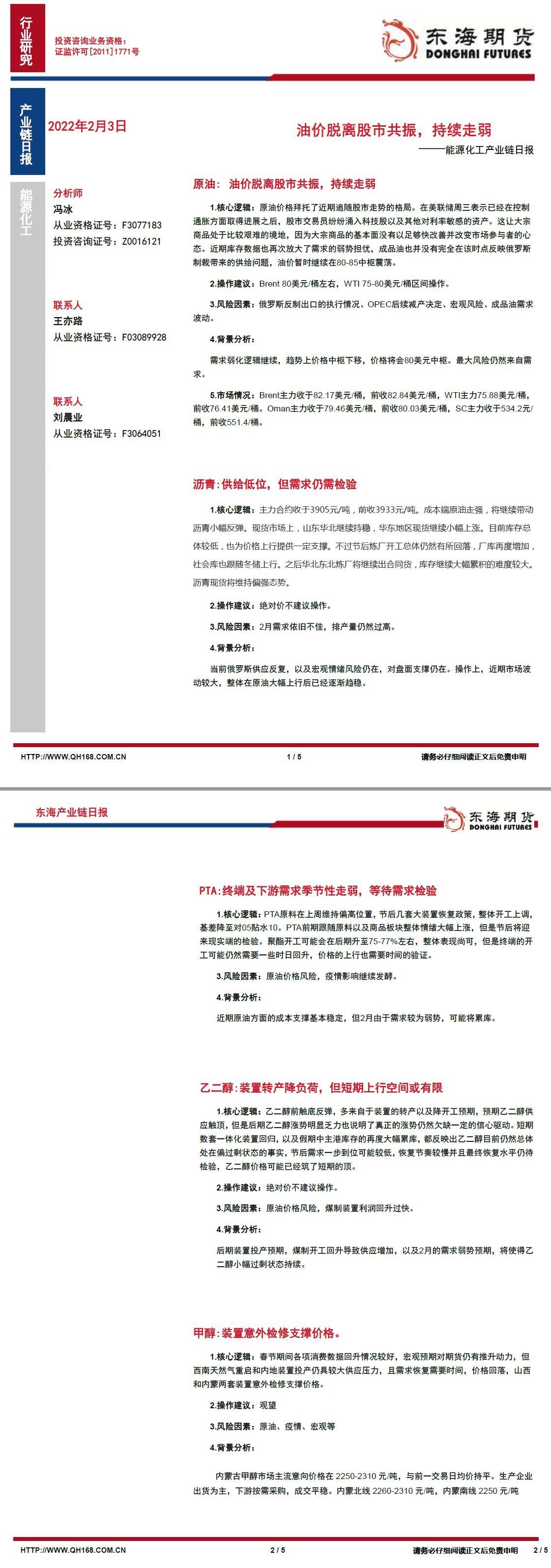 更新: 03 02月 嘉盛集团APP讯——原油:油价脱离股市共振,持续走弱沥青:供给低位,但需求仍需检验PTA:终端及下游需求季节性走弱,等待需求检验乙二醇:装置转产降负荷,但短期上行空间或有限甲醇:装置意外检修支撑价格L:估值偏高,有回落风险PP:下游需求有待恢复,期货价格震荡偏弱东海期货公司授权文本由“专注期货开户交易及专业行情分析资讯网站”:【一期货 www.1qh.cn】转发 标题:【东海期货2月3日产业链日报】能化篇:油价脱离股市共振,持续走弱 地址:https://www.jiasmai.com/article/1935.html ← 重磅新闻:第18届亚洲品牌盛典启动仪式在曼谷举行,两大亮点引关注! → 【东海期货2月3日产业链日报】贵金属篇:美元指数反弹,外盘金银下跌