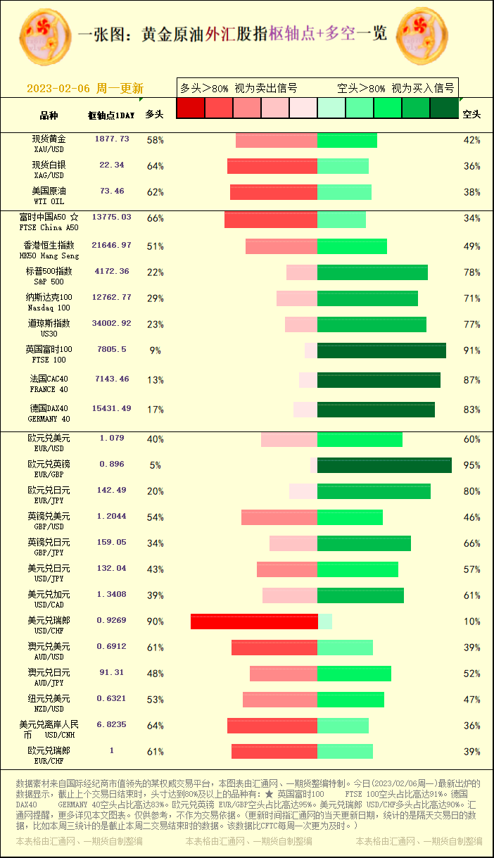 更新: 06 02月 嘉盛集团APP讯——一张图:黄金原油外汇股指"枢纽点+多空占比"一览。今日(2023/02/06周一)最新出炉的数据显示,截止上个交易日结束时,头寸达到80%及以上的品种有:★ 英国富时100 FTSE 100空头占比高达91%。德国DAX40 GERMANY 40空头占比高达83%。欧元兑英镑 EUR/GBP空头占比高达95%。美元兑瑞郎 USD/CHF多头占比高达90%。汇通网提醒,更多详见本文图表。仅供参考,不作为交易依据。【本图表涉及到的交易品种有:现货黄金、现货白银、美国原油、富时中国A50、香港恒生指数、标普500指数、纳斯达克指数、道琼斯指数、英国富时100、法国CAC40、德国DAX40、欧元兑美元、欧元兑英镑、欧元兑日元、英镑兑美元、英镑兑日元、美元兑日元、美元兑加元、美元兑瑞郎、澳元兑美元、澳元兑日元、纽元兑美元、美元兑离岸人民币、欧元兑瑞郎。】(更新时间指汇通网的当天更新日期,统计的是隔天交易日的数据,比如本周三统计的是截止本周二交易结束时的数据。该数据比CFTC每周一次更为及时。) 标题:一张图:黄金原油外汇股指"枢纽点+多空占比"一览(2023/02/06周一) 地址:https://www.jiasmai.com/article/1961.html ← 美国名嘴称1月份非农强劲,经济有韧性能应对更多加息 → 【华安期货】石油化工2月5日周报:复工预期不足,聚烯烃高位回落