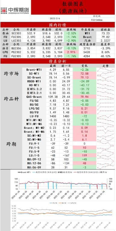 消息面:供需:据贝克休斯数据显示,截止2月3日当周,美国石油钻机数量为599座,环比下降10座,为2022年9月以来最低;据委内瑞拉国家石油公司(PDVSA)表示,委内瑞拉1月日均出口55.84万桶原油和燃料,较2022年12月下降19%。 地缘:欧盟对俄罗斯汽油、柴油、煤油设定100美元/桶上限,燃料油和石脑油设定为60美元/桶上限。