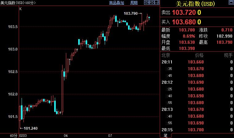 北京时间20:14,现货黄金上涨0.14%至1869.83美元/盎司;COMEX期金主力合约上涨0.15%至1882.3美元/盎司;美元指数上浮0.06%至103.692,盘中再创1月9日以来新高至103.801。
