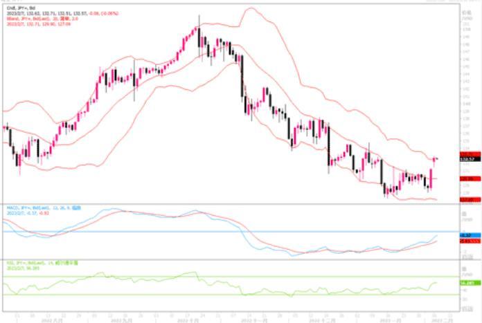 周一(2月6日)美元兑日元继续大幅上挺1.11%,盘中最高触及132.90,收盘于132.63。稍早《日经新闻》援引不具名政府和执政党消息人士报导,日本政府已经就央行副总裁雨宫正佳接替黑田东彦担任央行总裁一事征求了意见。雨宫正佳一直被认为是央行总裁职位竞争者中最鸽派的,这打击了日本央行政策正常化将在新总裁领导下取得进展的希望。叠加近期美国强劲非农数据所带来的冲击,日元近日走软较为剧烈。4小时图上美元兑日元出现超买迹象,或会出现短线小幅调整机会。但日线图上,则显示出较强的美元买盘迹象,上方关注133.35附近的阻力,若破位则可能威胁135前期较为密集交易的水平。当前,下方重新试低的概率似乎不大。