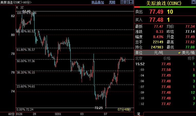 北京时间15:54,NYMEX原油期货上涨0.39%至77.44美元/桶;ICE布伦特原油期货上涨0.25%至83.90美元/桶。