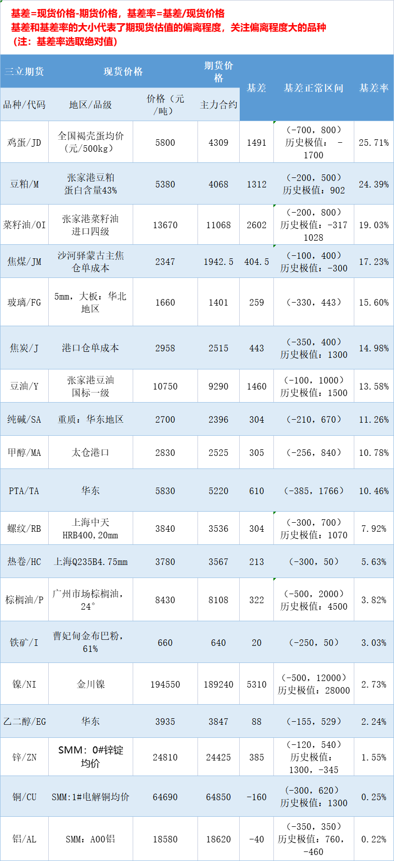 更新: 28 10月 三立期货10月28日基差:一张图尽览有色金属、黑色系、能源化工和农产品基差(按基差率从大到小排序)——排名前三的期货品种分别是鸡蛋、豆粕、菜籽油,基差率分别是25.71%、24.39%、19.03%。三立期货期货公司授权文本由“专注期货开户交易及专业行情分析资讯网站”【一期货 www.1qh.cn】转发。 标题:三立期货10月28日基差:一张图尽览有色金属、黑色系、能源化工和农产品基差(按基差率从大到小排序) 地址:https://www.jiasmai.com/article/201.html ← 三立期货10月28日早间内参——宏观 → 黄金交易提醒:美元反弹打击多头士气,关注美国PCE数据