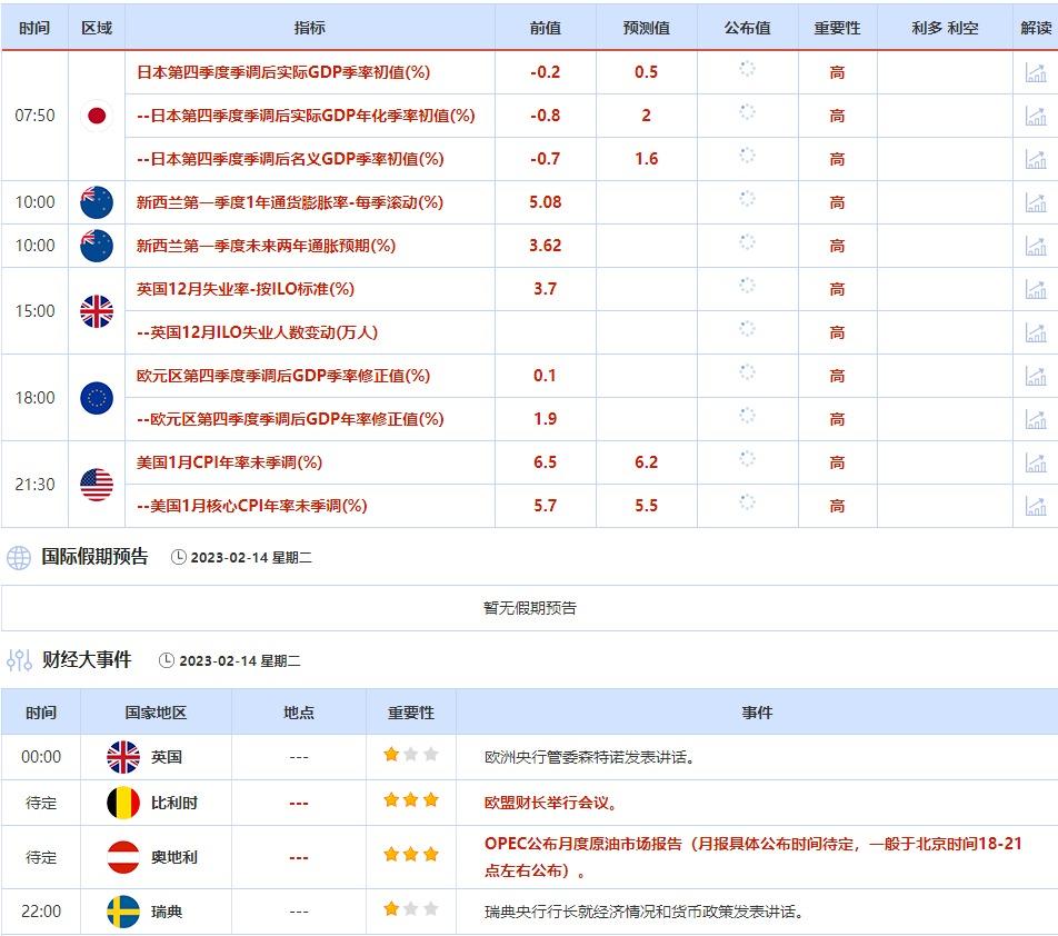 2月14日,美国将公布2023年1月CPI,目前市场预期美国1月CPI年率未季调为6.2%,略低于6.5%的前值;美国1月CPI月率季调后为0.5%,高于-0.1%的前值。