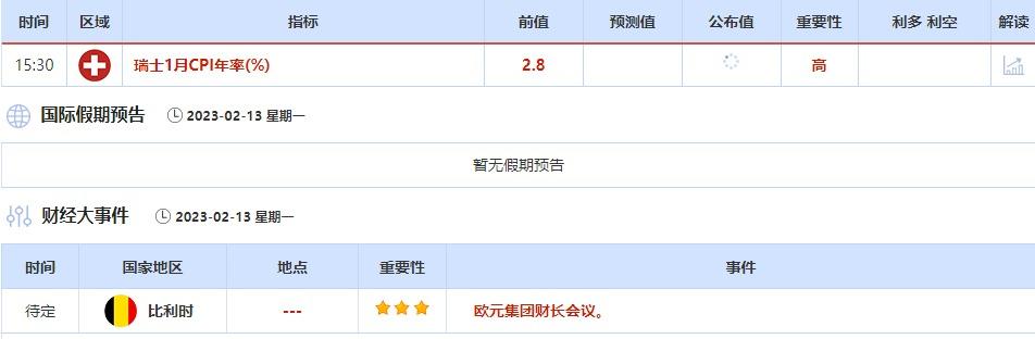 ①2月13日(周一)关键字:瑞士1月CPI年率,欧元集团财长会议