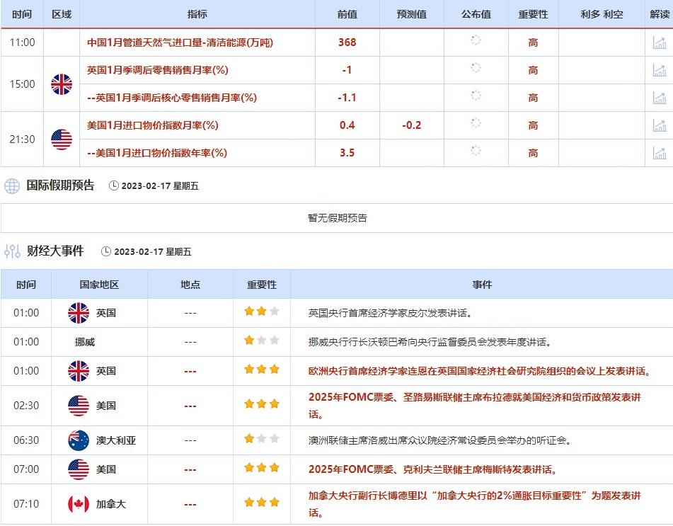 ⑤2月17日(周五)关键字:英国1月零售销售,克利夫兰联储主席梅斯特,加拿大央行副行长博德里