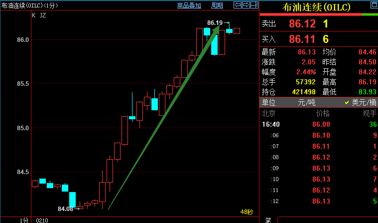 北京时间16:39,NYMEX原油期货上涨1.77%至79.44美元/桶;ICE布伦特原油期货上涨1.84%至86.06美元/桶。两市均创2月1日以来新高,分别至79.55美元/桶和86.19美元/桶。