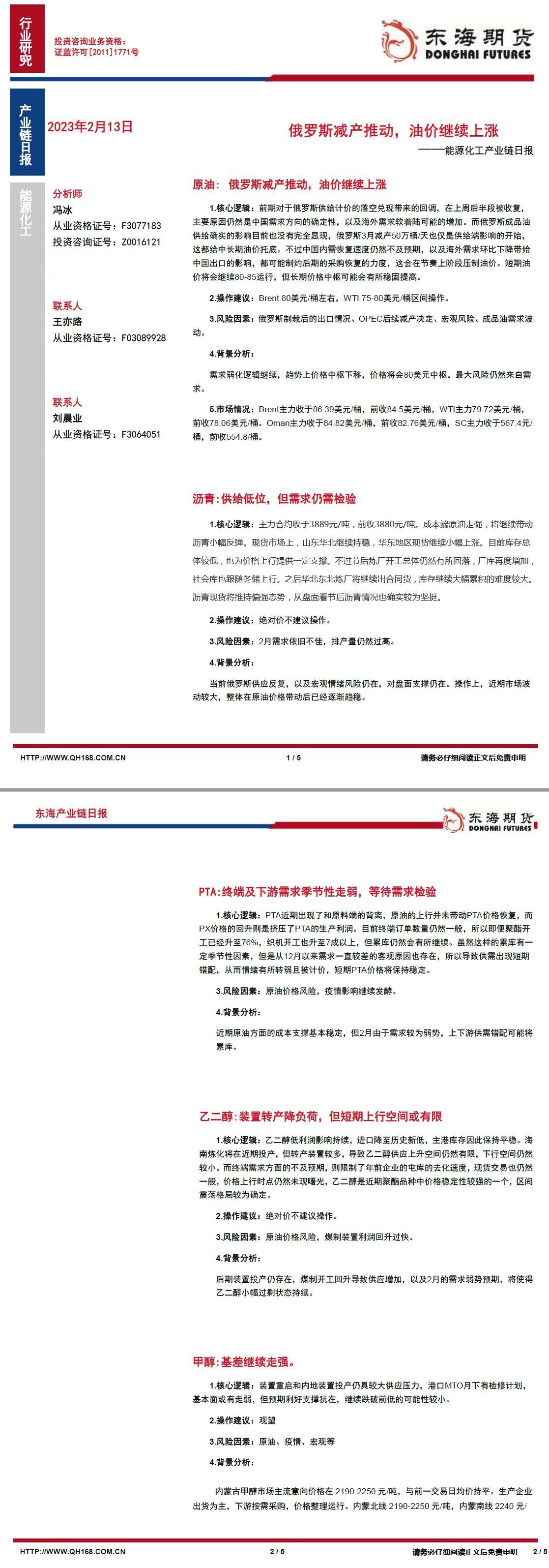 更新: 13 02月 嘉盛集团APP讯——原油:俄罗斯减产推动,油价继续上涨沥青:供给低位,但需求仍需检验PTA:终端及下游需求季节性走弱,等待需求检验乙二醇:装置转产降负荷,但短期上行空间或有限甲醇:基差继续走强L:价格企稳,震荡修复PP:下游需求有待恢复,期货价格震荡企稳东海期货公司授权文本由“专注期货开户交易及专业行情分析资讯网站”:【一期货 www.1qh.cn】转发 标题:【东海期货2月13日产业链日报】能化篇:俄罗斯减产推动,油价继续上涨 地址:https://www.jiasmai.com/article/2090.html ← 【东海期货2月13日宏观金融日报】中国1月金融数据大幅好于预期 → 【东海期货2月13日产业链日报】贵金属篇:美联储官员发言偏鸽,金银震荡
