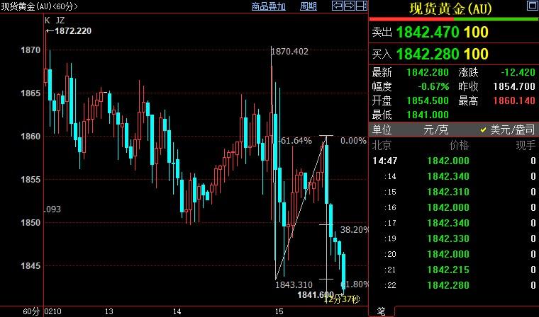 北京时间14:49,现货黄金下跌0.59%至1843.24美元/盎司;COMEX期金主力合约下跌0.65%至1853.2美元/盎司;美元指数上涨0.27%至103.533。