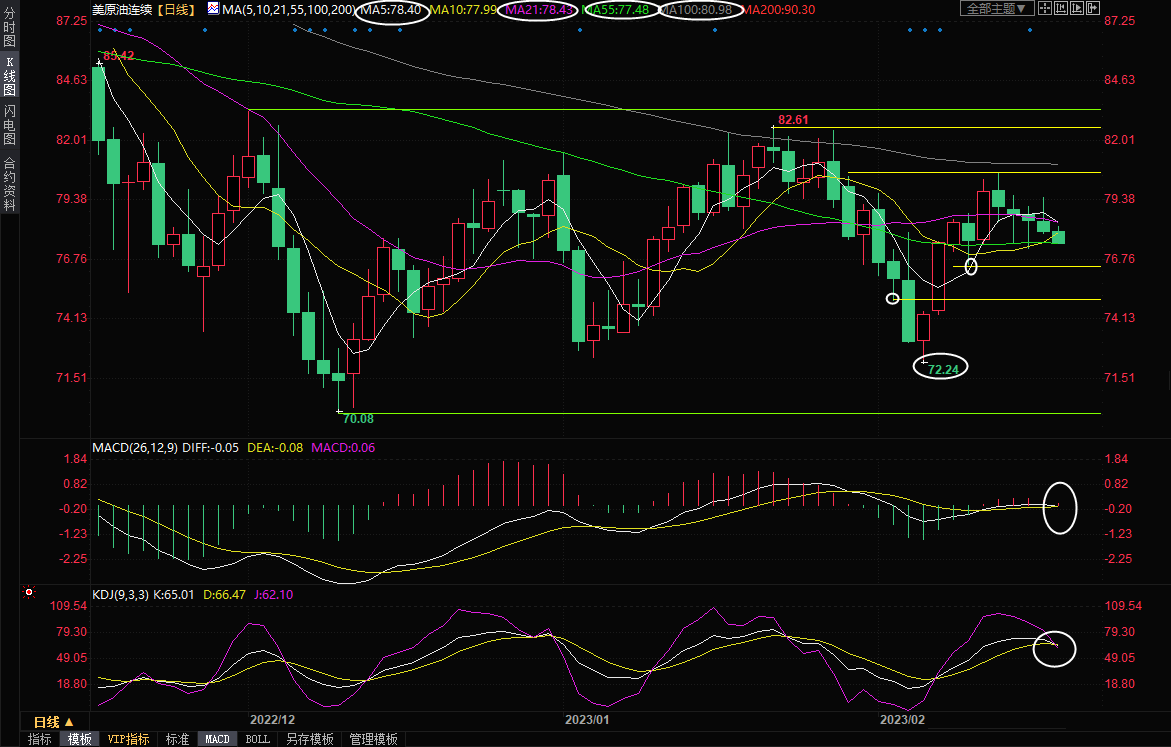 日线级别:震荡;MACD金叉被破坏并有死叉的趋势,KDJ接近死叉运行,油价上一交易日反弹受阻并回落至布林线中轨下方,目前正试探55日均线支撑,接近失守所有均线支撑,短线下行风险有所增加,留意2月9日低点76.51附近支撑,若失守该支撑,则增加短线看空信号;进一步支撑在布林线下轨74.56附近,2月3日低点支撑在73.09附近,2月6日低点支撑在72.44附近。