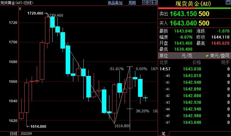 北京时间15:01,现货黄金下沉0.06%至1644.00美元/盎司;COMEX期金主力合约上浮0.12%至1646.6美元/盎司;美元指数上涨0.14%至111.829。