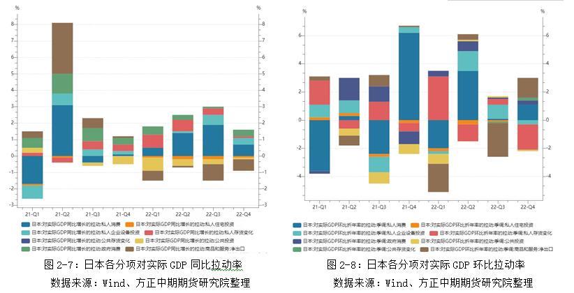 从产业来看,私人消费是日本经济的支柱,同比和环比增长1.2%和0.5%,对GDP同比和环比的拉动率分别达到0.6%和0.3%。并且,私人消费占日本GDP的比重愈来愈高,从2022年一季度的53.5%逐季度提升至2022年四季度的54.1%。2022年3月和9月,日本先后两次放宽疫情防控措施,刺激了日本旅游、餐饮、酒店产业的发展,2022年4月至2023年1月期间日本服务业PMI仅2022年8月跌破荣枯线,其他8个月均高于荣枯线。第二大拉动因素是政府消费,创造的GDP达到29.86万亿日元,占日本GDP总量比重的21.8%,同比和环比增长1.7%和0.3%,对GDP同比和环比的拉动率分别达到0.4%和0.1%。在2022年各国政府纷纷收紧财政和货币政策对抗通胀之时,日本政府却是全球为数不多依然坚持超宽松财政和货币政策的政府,在去年10月28日日本首相岸田文雄宣布了71.6万亿日元的天量经济刺激方案。相较而言,净出口则成为拖累日本GDP最核心因素,GDP负项规模达到-4742.3亿日元,而在2021年四季度日本净出口GDP依然是正值。日本是资源进口大国,需要进口大量原油、铁矿石、煤炭等资源,去年日元兑美元大幅贬值导致日本进口负担加重,2022年四季度日本进口GDP(负项)为28.2万亿日元,同比增长10.2%。不过,随着2022年四季度美联储逐步放缓加息步伐,美元指数走弱,日元大幅收获此前失地,因此净出口GDP的负项规模环比收窄超过五成。