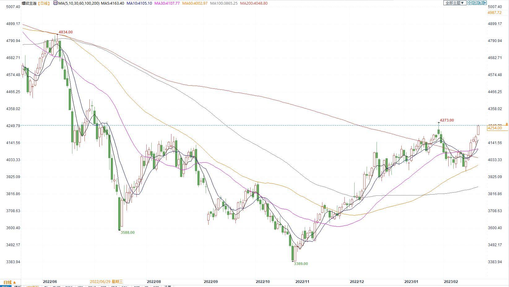 价格:今日,黑色系各品种强势拉升。螺纹钢2305合约自夜盘以来连续上行,白天小幅回调后再次走强,一度冲最近新高4258。日K收大阳线,收盘价4254元/吨,较上一交易日上涨87点,收涨2.09%。螺纹钢现货价继续上涨,今日上海中天价格4250元/吨,环比增30元/吨。