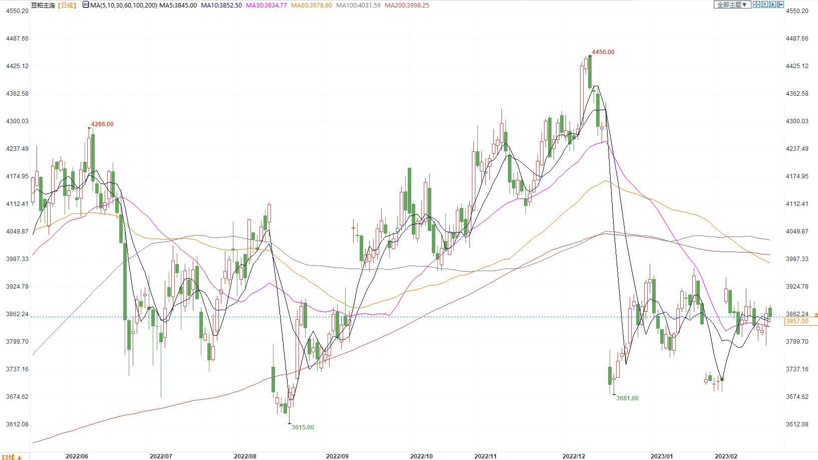 豆粕2305合约日内涨0.44%,收盘价3857元/吨,张家港市场豆粕4400元/吨。