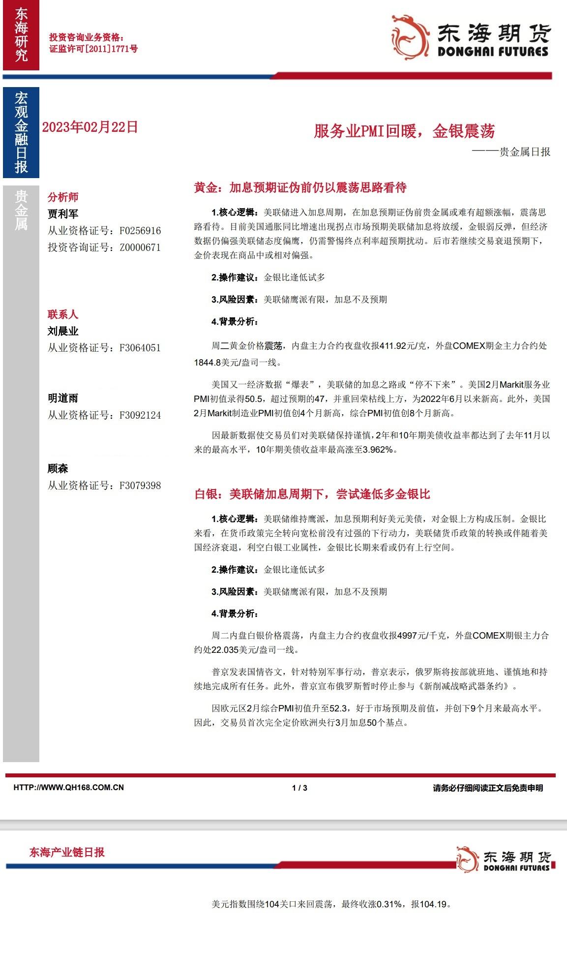 更新: 22 02月 嘉盛集团APP讯——黄金:加息预期证伪前仍以震荡思路看待。白银:美联储加息周期下,尝试逢低多金银比。东海期货公司授权文本由“专注期货开户交易及专业行情分析资讯网站”:【一期货 www.1qh.cn】转发 标题:【东海期货2月22日产业链日报】贵金属篇:服务业PMI回暖,金银震荡 地址:https://www.jiasmai.com/article/2242.html ← 道指狂泻近700点!华尔街遭遇年内最惨一天 今晚美联储纪要来袭 → 现货黄金重新走高,市场等待FED新一轮“走钢丝”表演