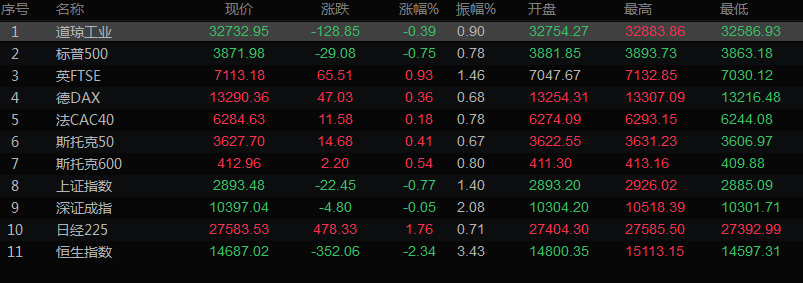 美股收盘情况:道琼斯工业指数下跌0.39%,至32732.95点;标普500指数下跌0.75%,至3871.98点;纳斯达克指数下跌1.03%,至10988.15。
