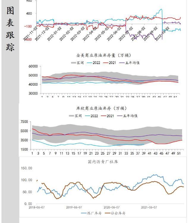 供应端:据美国能源信息署最新数据显示,截止2022年10月21日当周,包括战略储备在内的美国原油库存总量8.41663亿桶,比前一周下降829万桶;美国商业原油库存量4.39945亿桶,比前一周上涨258.8万桶;战略原油库存量4.01718亿桶,比上一周下降341.7万桶;美国汽油库存总量2.0789亿桶,比前一周下降147.8万桶。商业原油库存比去年同期高2.12%,比过去五年同期低1.17%;汽油库存比去年同期低3.64%,比过去五年同期低约6.70%;馏份油库存比去年同期低14.89%,比过去五年同期低20.21%。