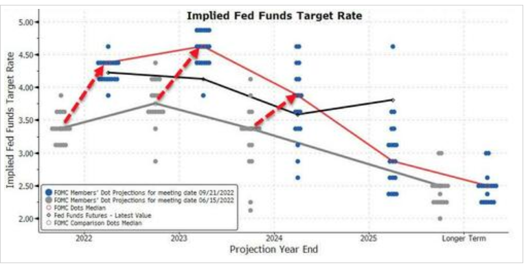 一方面,美联储自身9月发布的利率点阵图,本身就在暗示年底两次会议不太可能会都加息75个基点。美联储预计的年底利率中值落在4.4%,这仅仅支持美联储在11月和12月的会议上累计加息125个基点。