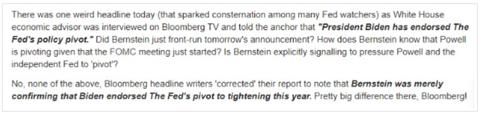 这迅速引发了华尔街的猜测,Bernstein怎么知道鲍威尔要转向?Bernstein是否在明确向鲍威尔和美联储施压,要求其“转向”?好在,最终这一切被证实只是一个“误会”。相关媒体事后“更正”了他们的报道,指出Bernstein只是在确认拜登支持美联储今年转向紧缩的政策。