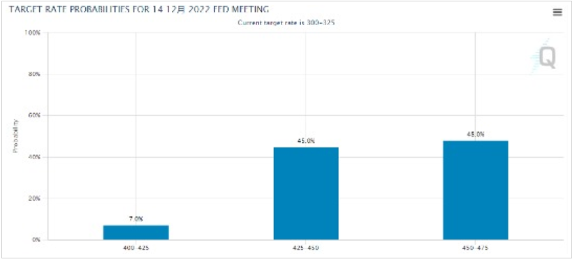 根据芝商所的美联储观察工具显示,市场目前预计美联储在12月议息会议上加息至4.5%-4.75%的概率为48%。这意味着市场暂时相信,在本周会议加息75个基点后,美联储在12月将加息步伐缩减至50个基点的可能性,要略微大于加息75个基点的可能性。