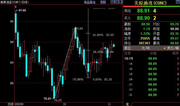 北京时间16:20,NYMEX原油期货下跌1.22%至88.90美元/桶;ICE布伦特原油期货下跌1.00%至95.20美元/桶。