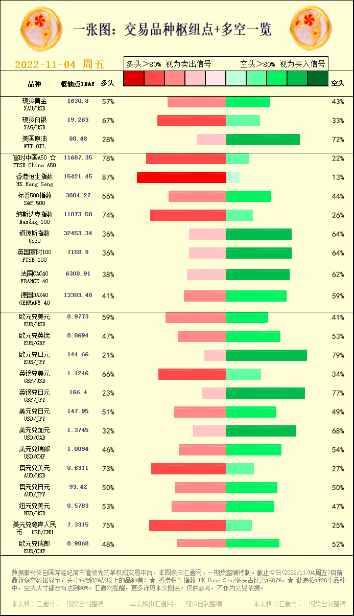 更新: 04 11月 一张图:交易品种枢纽点+多空占比一览。截止今日(2022/11/04周五)目前最新多空数据显示,头寸达到80%及以上的品种有:★ 香港恒生指数 HK Hang Seng多头占比高达87%。★ 此表格近20个品种中,空头头寸都没有达到80%。汇通网提醒,更多详见本文图表。仅供参考,不作为交易依据。【本图表涉及到的交易品种有:现货黄金、现货白银、美国原油、富时中国A50、香港恒生指数、标普500指数、纳斯达克指数、道琼斯指数、英国富时100、法国CAC40、德国DAX40、欧元兑美元、欧元兑英镑、欧元兑日元、英镑兑美元、英镑兑日元、美元兑日元、美元兑加元、美元兑瑞郎、澳元兑美元、澳元兑日元、纽元兑美元、美元兑离岸人民币、欧元兑瑞郎。】 标题:一张图:交易品种枢纽点+多空占比一览(2022/11/04周五) 地址:https://www.jiasmai.com/article/337.html ← 现货黄金短线交易策略:预期非农不佳美元回调,多头大举反攻 → CFTC商品持仓解读:美元净多头押注降至一年新低,原油净多头再增3万逾手