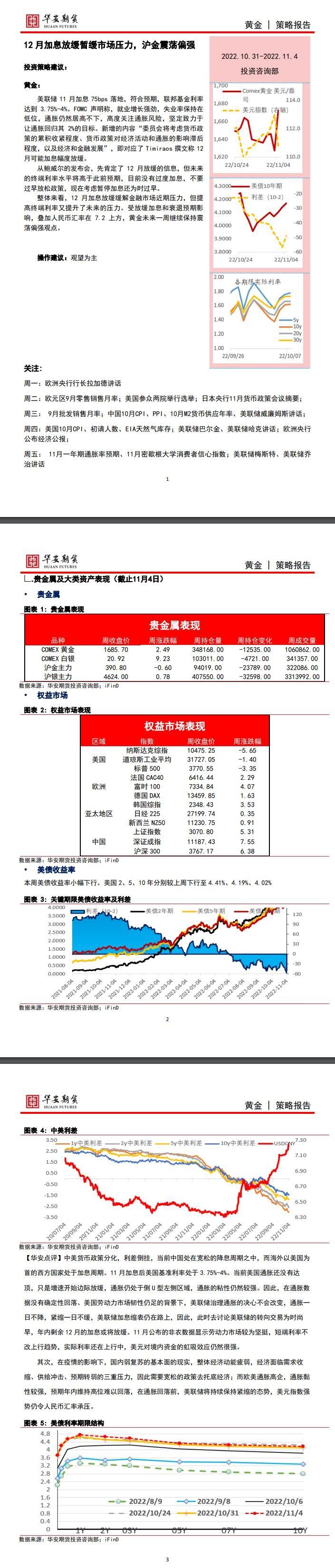 整体来看,12月加息放缓缓解金融市场近期压力,但提高终端利率又提升了未来的压力。受放缓加息和衰退预期影响,叠加人民币汇率在7.2上方,黄金未来一周继续保持震荡偏强观点。