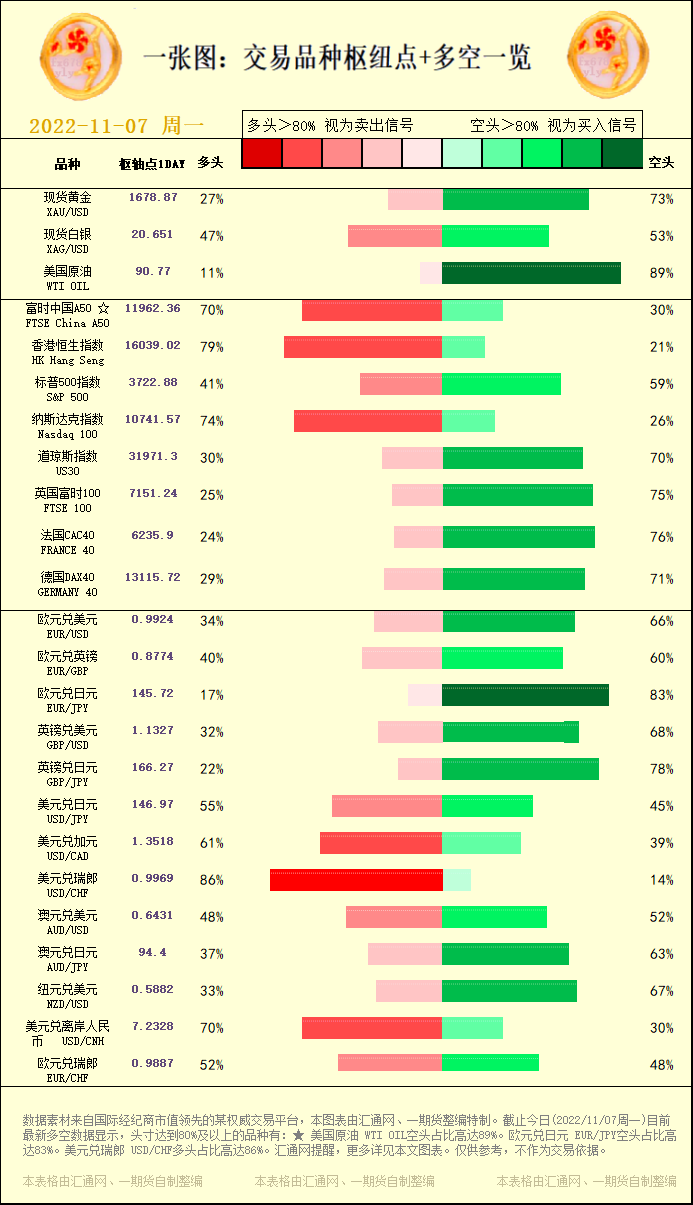 更新: 07 11月 一张图:交易品种枢纽点+多空占比一览。截止今日(2022/11/07周一)目前最新多空数据显示,头寸达到80%及以上的品种有:★ 美国原油 WTI OIL空头占比高达89%。欧元兑日元 EUR/JPY空头占比高达83%。美元兑瑞郎 USD/CHF多头占比高达86%。汇通网提醒,更多详见本文图表。仅供参考,不作为交易依据。【本图表涉及到的交易品种有:现货黄金、现货白银、美国原油、富时中国A50、香港恒生指数、标普500指数、纳斯达克指数、道琼斯指数、英国富时100、法国CAC40、德国DAX40、欧元兑美元、欧元兑英镑、欧元兑日元、英镑兑美元、英镑兑日元、美元兑日元、美元兑加元、美元兑瑞郎、澳元兑美元、澳元兑日元、纽元兑美元、美元兑离岸人民币、欧元兑瑞郎。】 标题:一张图:交易品种枢纽点+多空占比一览(2022/11/07周一) 地址:https://www.jiasmai.com/article/360.html ← 【华安期货】贵金属11月6日周报:12月加息放缓暂缓市场压力,沪金震荡偏强 → 期货公司观点汇总一张图:11月7日农产品(棉花、豆粕、白糖、玉米、鸡蛋、生猪等)