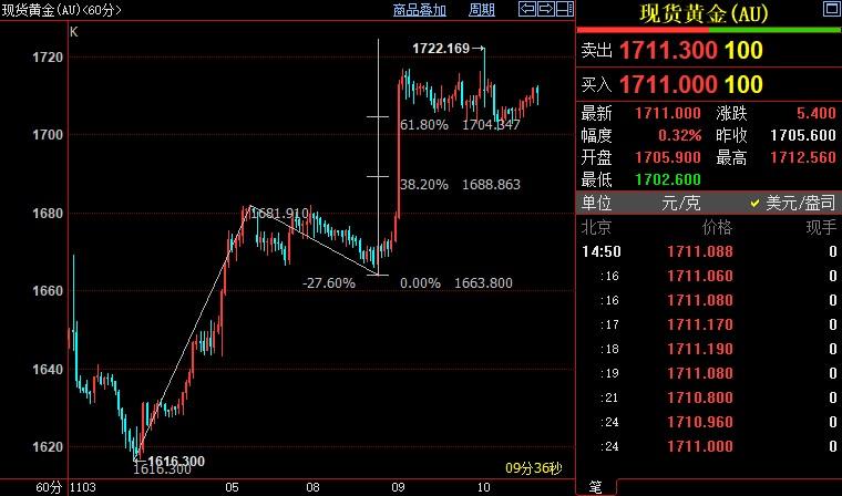 北京时间14:54,现货黄金上浮0.20%至1709.95美元/盎司;COMEX期金主力合约下跌0.04%至1713.1美元/盎司;美元指数下跌0.21%至110.198。